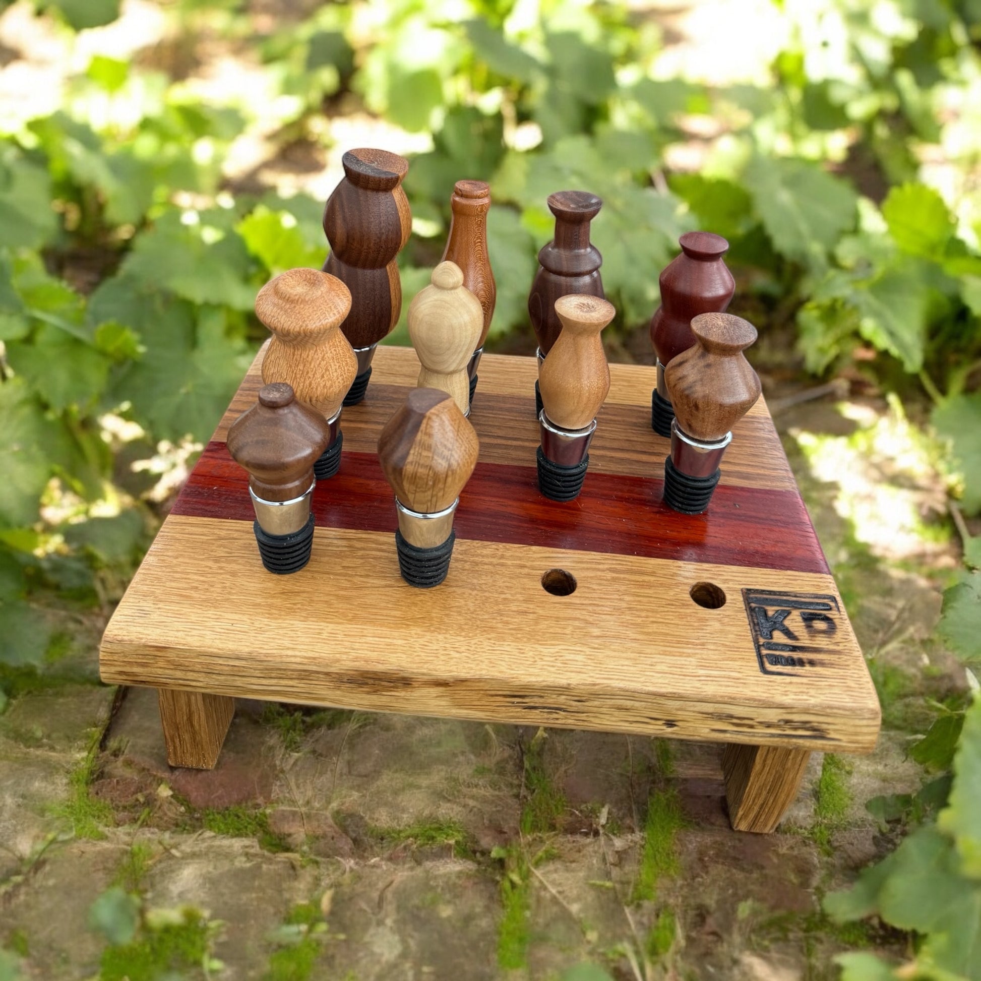 A variety of wine bottle stoppers are available. If you choose to add to cart and purchase I will contact you via email to discuss which specific topper you would like.